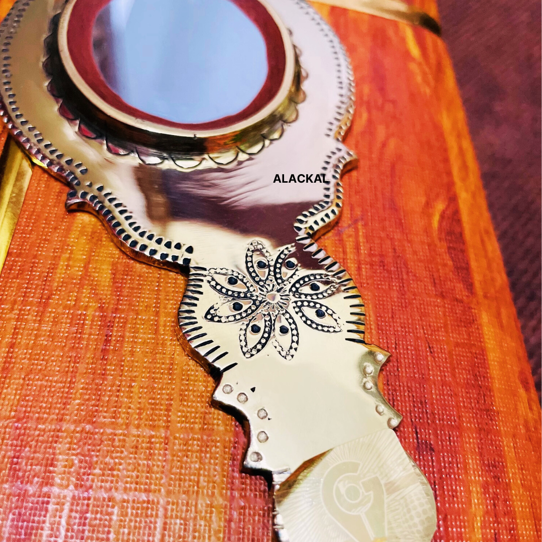 Enhance your Vishukani decorations with the traditional and authentic Valkannadi, handcrafted by skilled artisans at Alackal Bell Metals in Kerala. The metal mirror holds great significance during this auspicious festival, and purchasing it directly from the artisans ensures its quality and authenticity. Elevate your Vishu celebrations with this special piece.