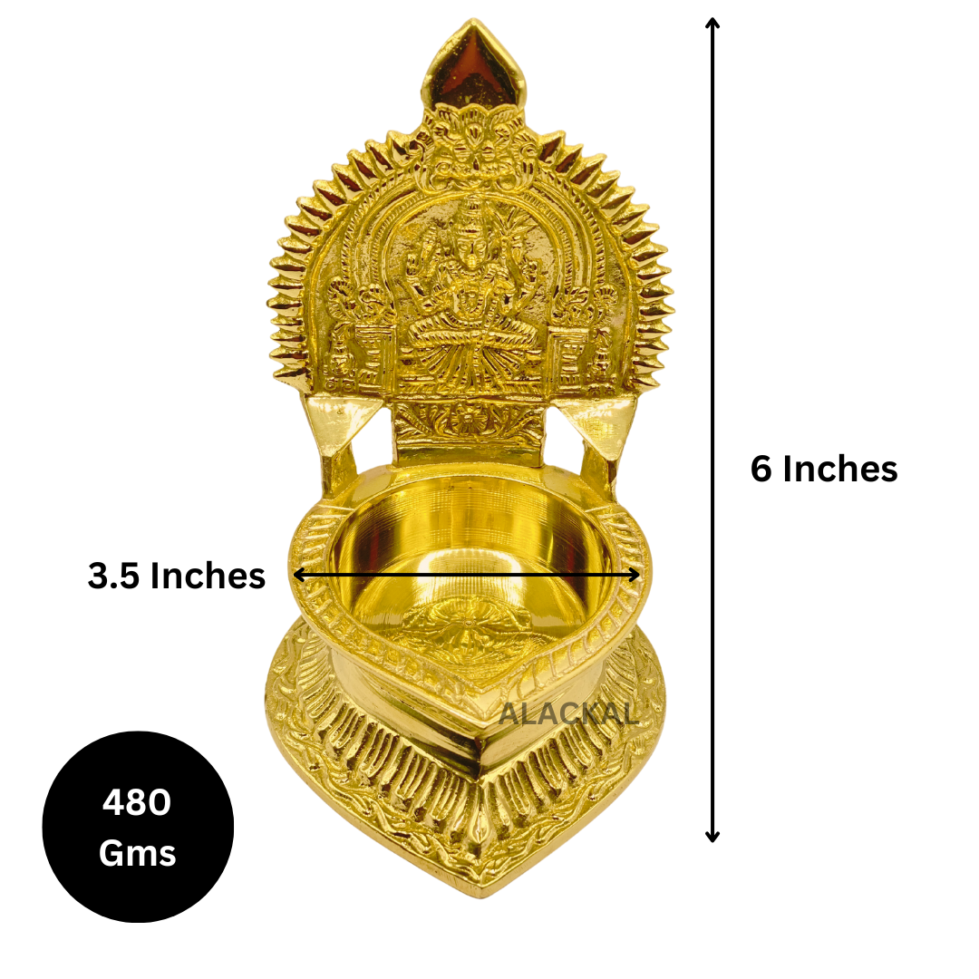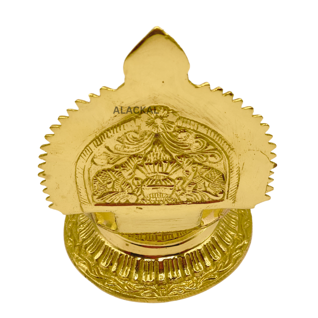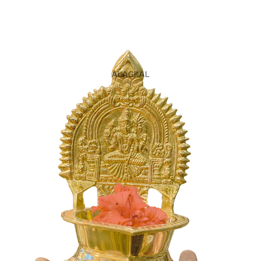 The lamp, crafted from brass, is chosen for its durability, resistance to corrosion, and the warm golden glow it imparts. The design of the Kamakshi Amman Lamp incorporates intricate detailing and traditional motifs that pay homage to the goddess Kamakshi, a revered form of the Divine Mother in Hinduism. These details not only serve an aesthetic purpose but also contribute to the spiritual significance of the lamp.
