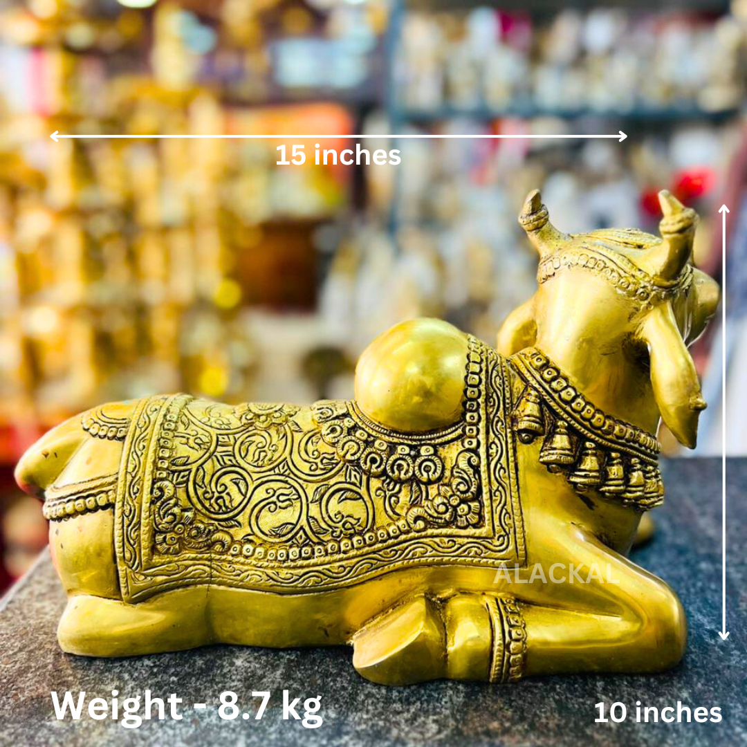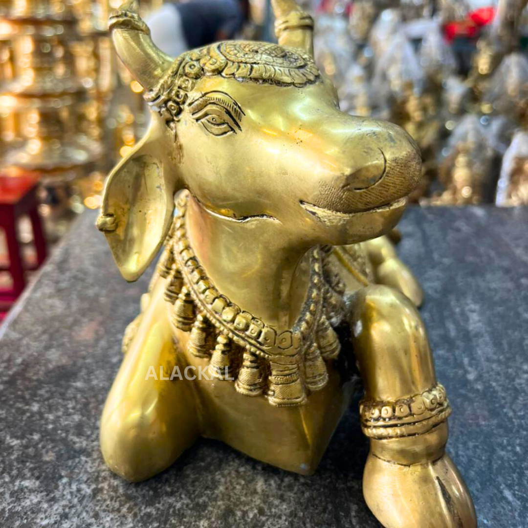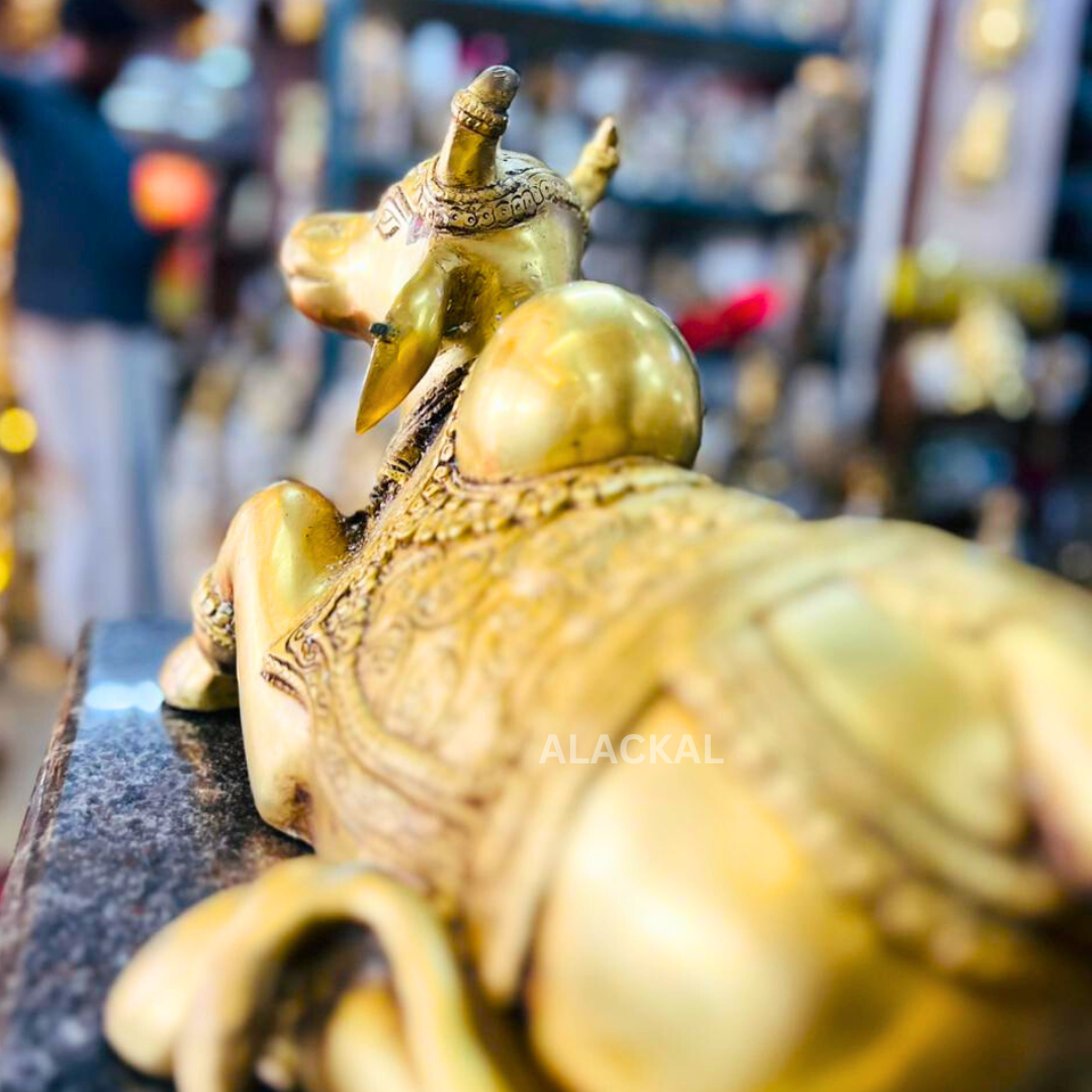 - One of the most captivating features of the brass Nandhi from Alackal Bell Metals is the high-quality brass polish that gives it a radiant glow. The surface finish is smooth, reflecting the divine energy associated with Lord Shiva. Over time, the brass takes on a natural patina, enhancing its beauty and adding a sense of antiquity, which fits seamlessly into the temple environment.