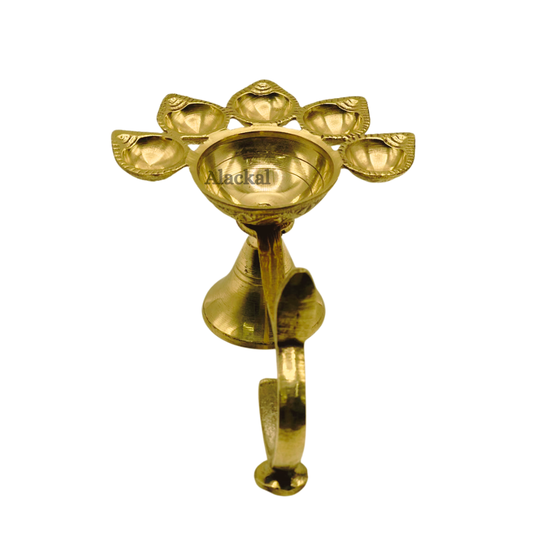 This brass pancharathi is designed to enhance your temple and home pooja rituals with its 5 wicks, crafted by Alackal Bell Metals. Its traditional design and durable material make it the perfect addition to your spiritual practice. Whether in the grandeur of a temple ceremony or the intimacy of your home pooja, the Brass Pancharathi is designed to add a touch of ceremonial brilliance. Its size is ideal for both settings, making it a versatile accessory that bridges the sacred space between temple rituals and personal worship at home.