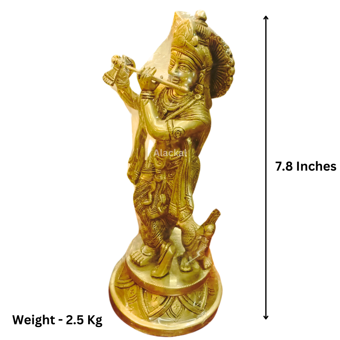 Brass, the primary material used in this idol, is considered a sacred metal in Hindu rituals. Brass idols are believed to carry positive energy and are often used in homes and temples for daily worship. The golden hue of brass symbolizes purity, knowledge, and the light of divinity. It is believed that the brass Krishna idol brings peace, harmony, and spiritual prosperity to the household.
