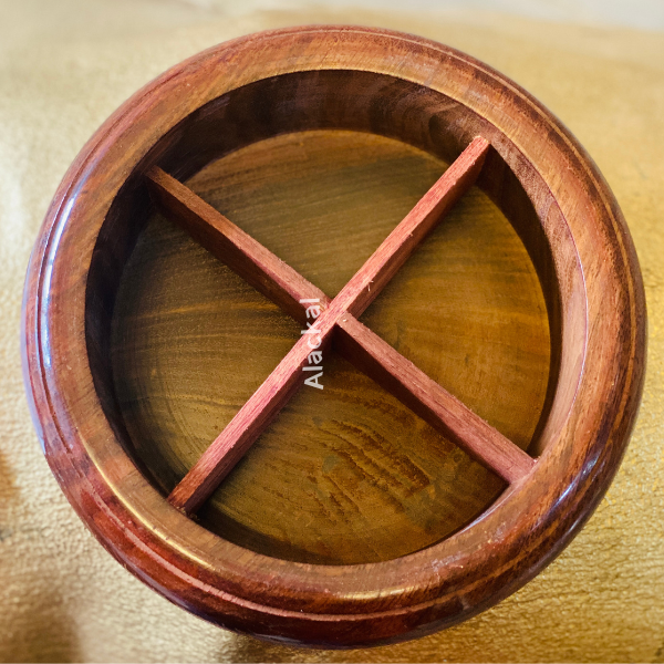 Upgrade your kitchen with this Wooden Round Masala Box with 4 Containers today! Keep your spices fresh, organized, and accessible with this traditional yet functional Masala Dani from Alackal Bell Metals, Mannar.