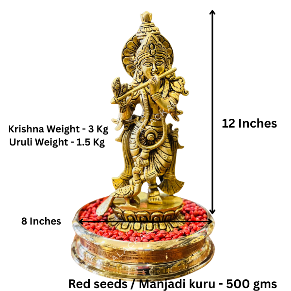 Bring home a divine blend of tradition and elegance with this 1-feet tall handcrafted Brass Krishna Idol accompanied by a stunning brass uruli filled with vibrant red Manjadikuru (lucky seeds) – a timeless symbol of prosperity and positivity.