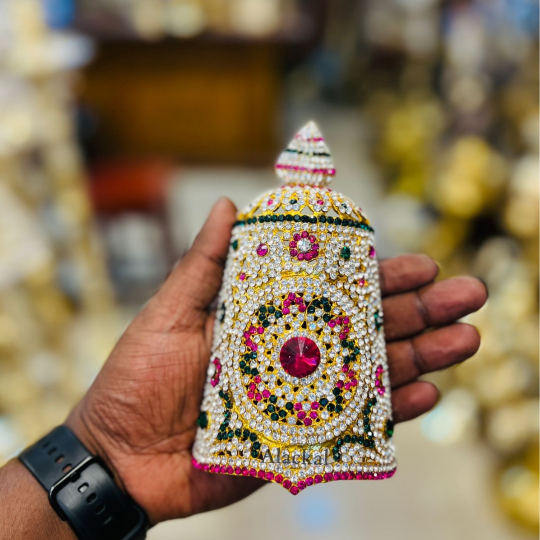 In Hindu temple traditions, adorning the deity with ornaments symbolizes devotion, respect, and celebration of the divine presence. The stone crown (kireedom) is one of the most sacred ornaments, representing the divine sovereignty of gods and goddesses. The Stone Crown with red, white, and green stones from Alackal Bell Metals, Mannar is carefully designed by expert artisans who specialize in handmade temple jewelry and pooja accessories. Every piece is crafted with precision to ensure it perfectly fits deity idols of various sizes — from small pooja idols to large temple statues.