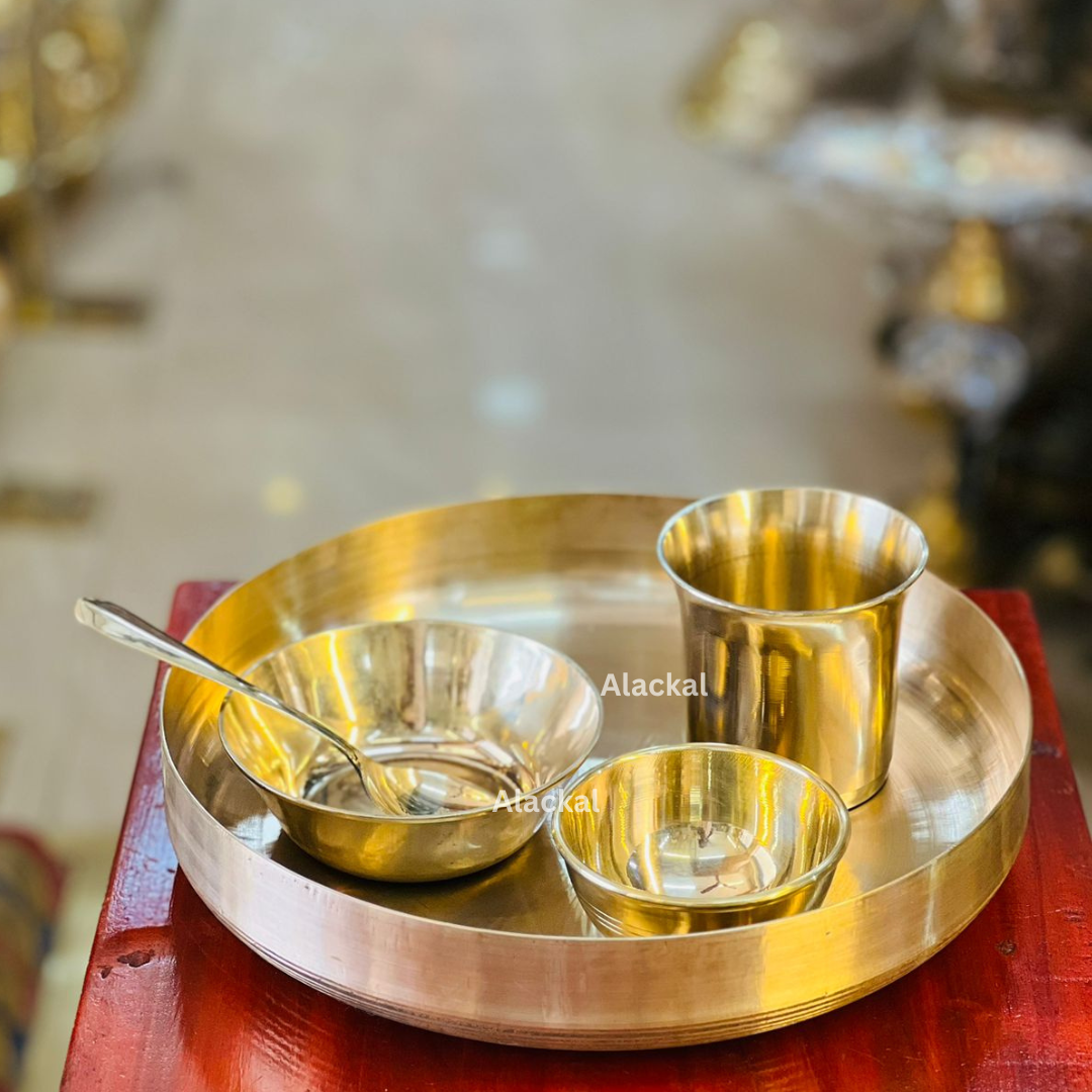 - The Handmade Bronze Thali Set from Alackal Bell Metals brings an aesthetic appeal to your dining table. The warm, golden hue of bronze offers a rustic yet regal charm that instantly elevates the dining experience, making it perfect for family meals, festive occasions, and celebrations.