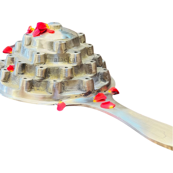 The extended handle allows priests and devotees to perform Deeparadhana safely without burning their hands.