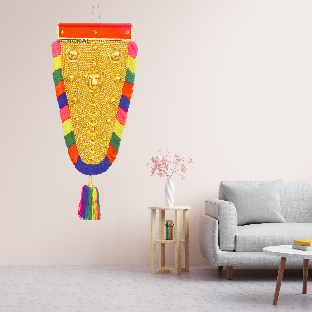 Placed in the living room, above the entrance, or in a dedicated pooja room, the Nettipattam becomes a focal point of decor. Its rich golden hues contrast beautifully against modern neutral tones, making it a versatile piece that can enhance any interior style.