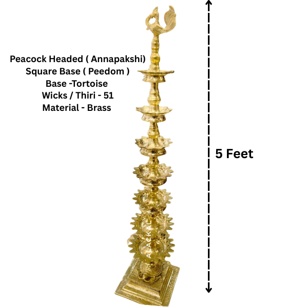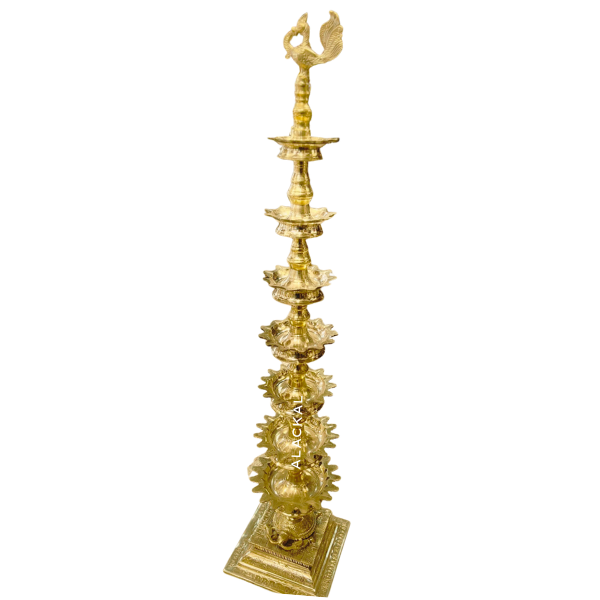 brass deepasthambham, sthambha vilakku Kerala, brass lamp with peacock head, Annapakshi vilakku, 51 wick brass lamp, tortoise base diya, traditional brass temple lamp, handmade vilakku from Mannar, Alackal Bell Metals, spiritual brass lamp, Kerala wedding brass decor, housewarming lamp brass, handmade Hindu pooja lamp