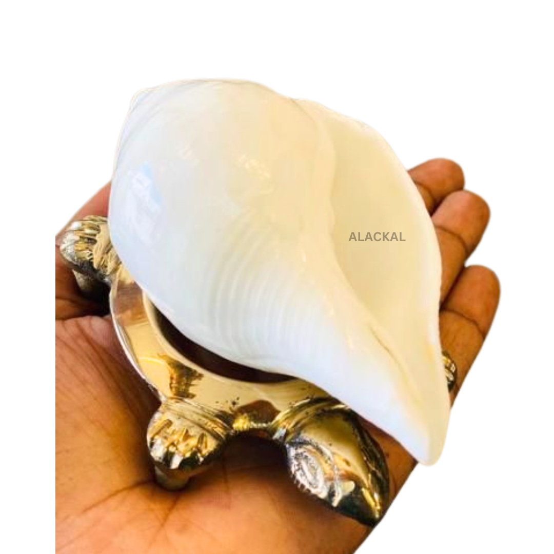 Unveiling Sacred Harmony: The Pooja Theertha Shankh with Brass Tortoise-Headed Stand