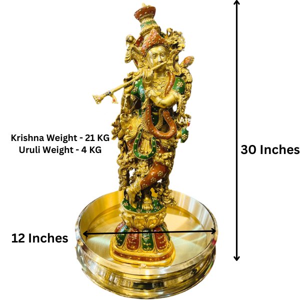Are you looking for an exquisite, traditional Vishukani decor that symbolizes divine blessings, prosperity, and auspicious beginnings? The Brass Multicolor Stone Lord Krishna Idol (30-inch) with Handmade Bronze Otturuli (Cooking Uruli) from Alackal Bell Metals, Mannar, is a perfect addition to your pooja room, home temple, or Vishu celebration setup.