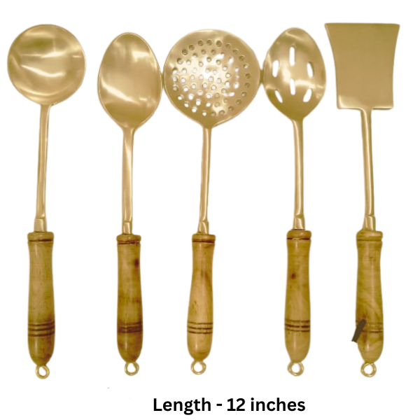 Each utensil is designed with a pure polished brass head and a sturdy wooden handle, measuring approximately 35.5 cm in length, ensuring long-lasting performance and comfortable grip.