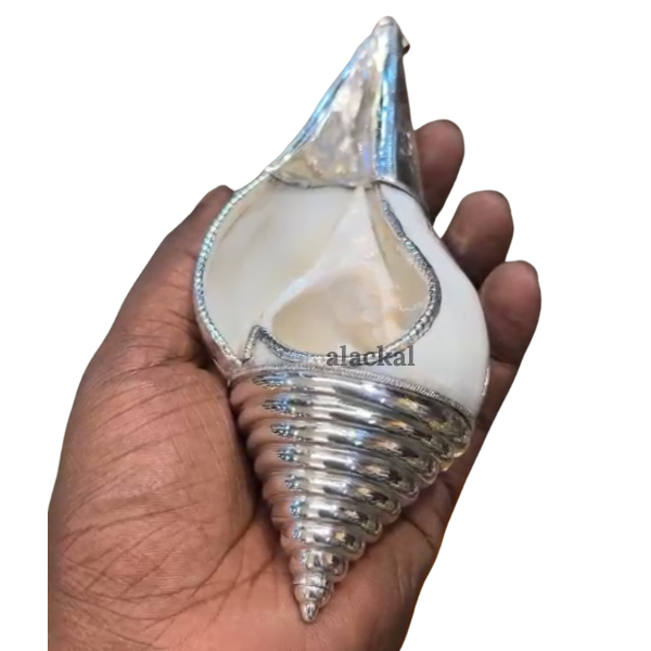 If you are looking for an authentic pure silver covered Shankh (conch) for your daily Hindu pooja rituals, temple pooja, or spiritual ceremonies, then Alackal Bell Metals, Mannar, brings you an exquisite handcrafted silver-plated pooja shankh. This auspicious conch shell, adorned with a premium quality silver covering and red beads at the tip, enhances the divinity and grandeur of any spiritual setting, temple, or home mandir.