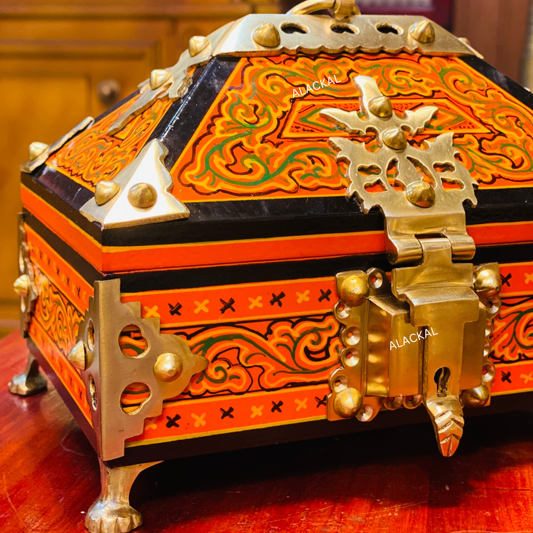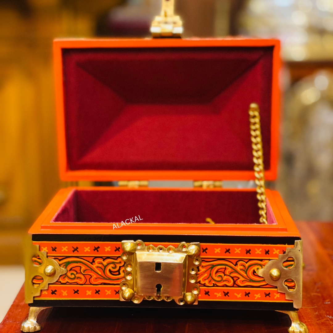 Beyond its functional role as a jewelry box, the Netturpetti is an exceptional showpiece and decorative item. Its vibrant orange color and mural designs make it a striking addition to any home decor. Whether placed in the living room, bedroom, or puja room, the brass corners, legs, and handle create a regal appearance, making the box a conversation starter.